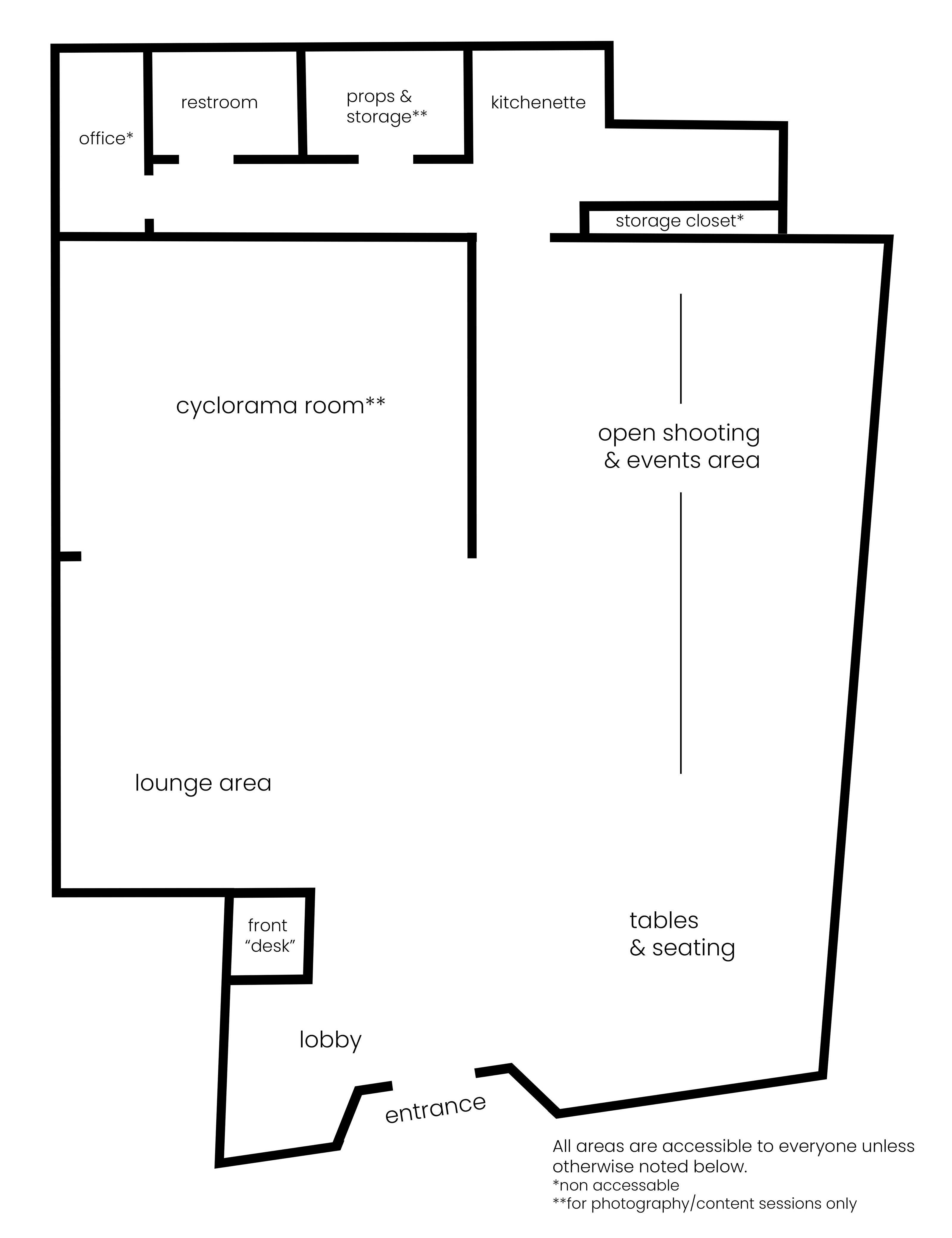 Studio hours are M-F, 9am-8pm. Setup and breakdown must be completed within the booked time. All participants must exit by the scheduled end time.